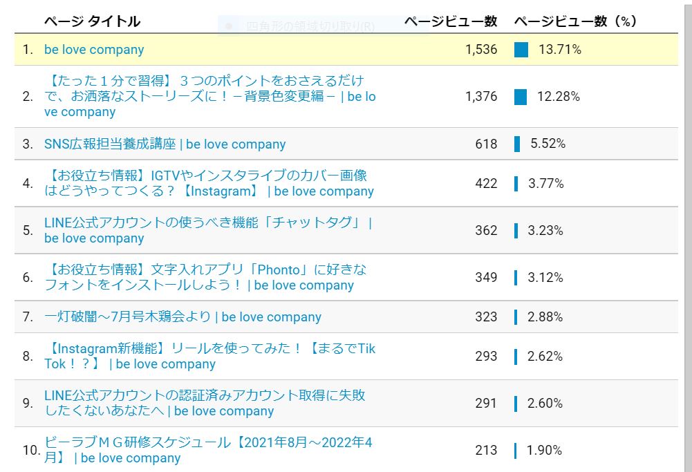 1位はトップページ、2位はインスタストーリーズ背景、3位のなんと、私達イチオシのSNS広報担当養成講座が来ています。