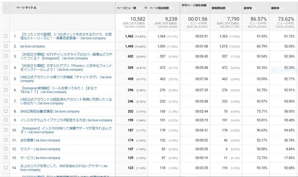 相変わらずインスタストーリーズ背景色変え方が1位ですが、ビーラブカンパニートップページや、SNS広報担当養成講座、会社概要、セミナー、サービスなどをご覧になられている方は、離脱率が低く、他のページをきちんとご覧になられていることがわかります。