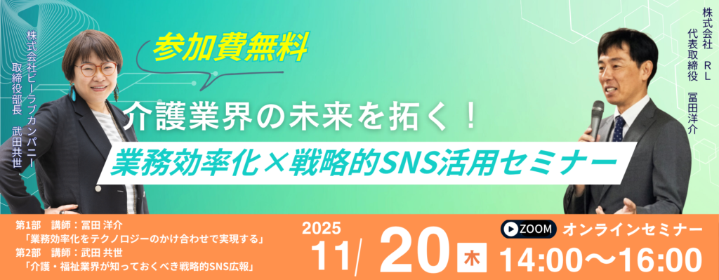 2025年11月20日に「介護業界の未来を拓く!業務効率化×戦略的SNS活用セミナー」を開催します。