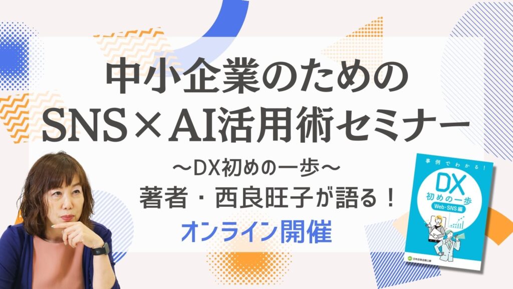 2/4(水) AI×SNS 中小企業のためのSNS×AI活用術セミナー ~DX初めの一歩~ 著者・西良旺子が語る!【オンライン開催】