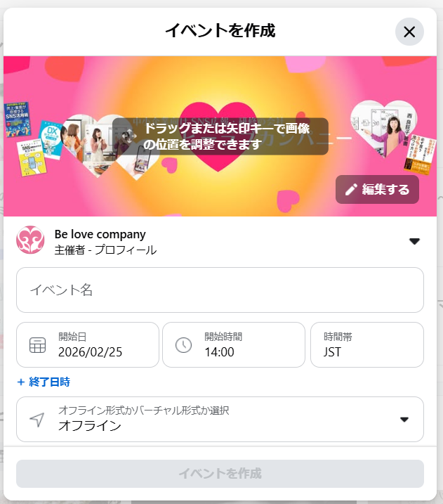 ③イベント名、日時、およびイベントがオフラインかバーチャルかを選択