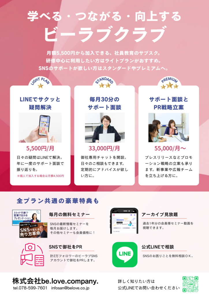 ビーラブクラブは、月額5,500円から加入できる社員教育のサブスク。