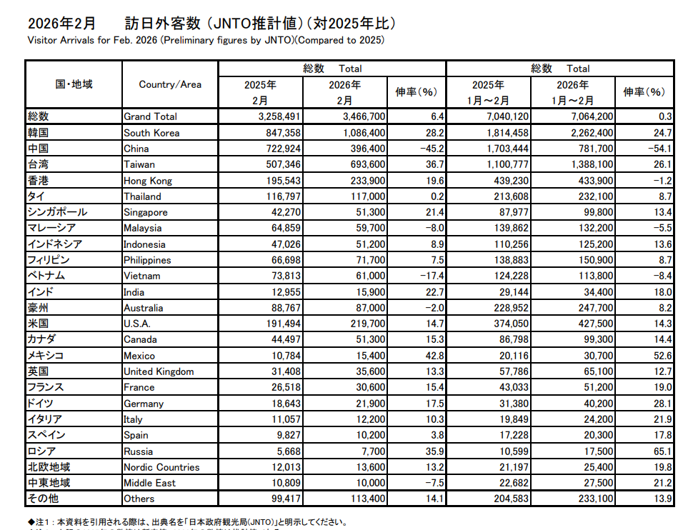 2026年2月の訪日外国人数は、前年同月比で+6.4%と増加しています。
