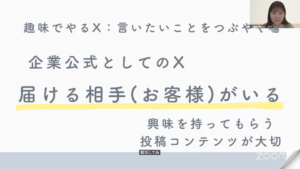 X担当として、なぜXキャンペーンをやるのか。どんなことを意識して取り組んでいるのかをお話しました。